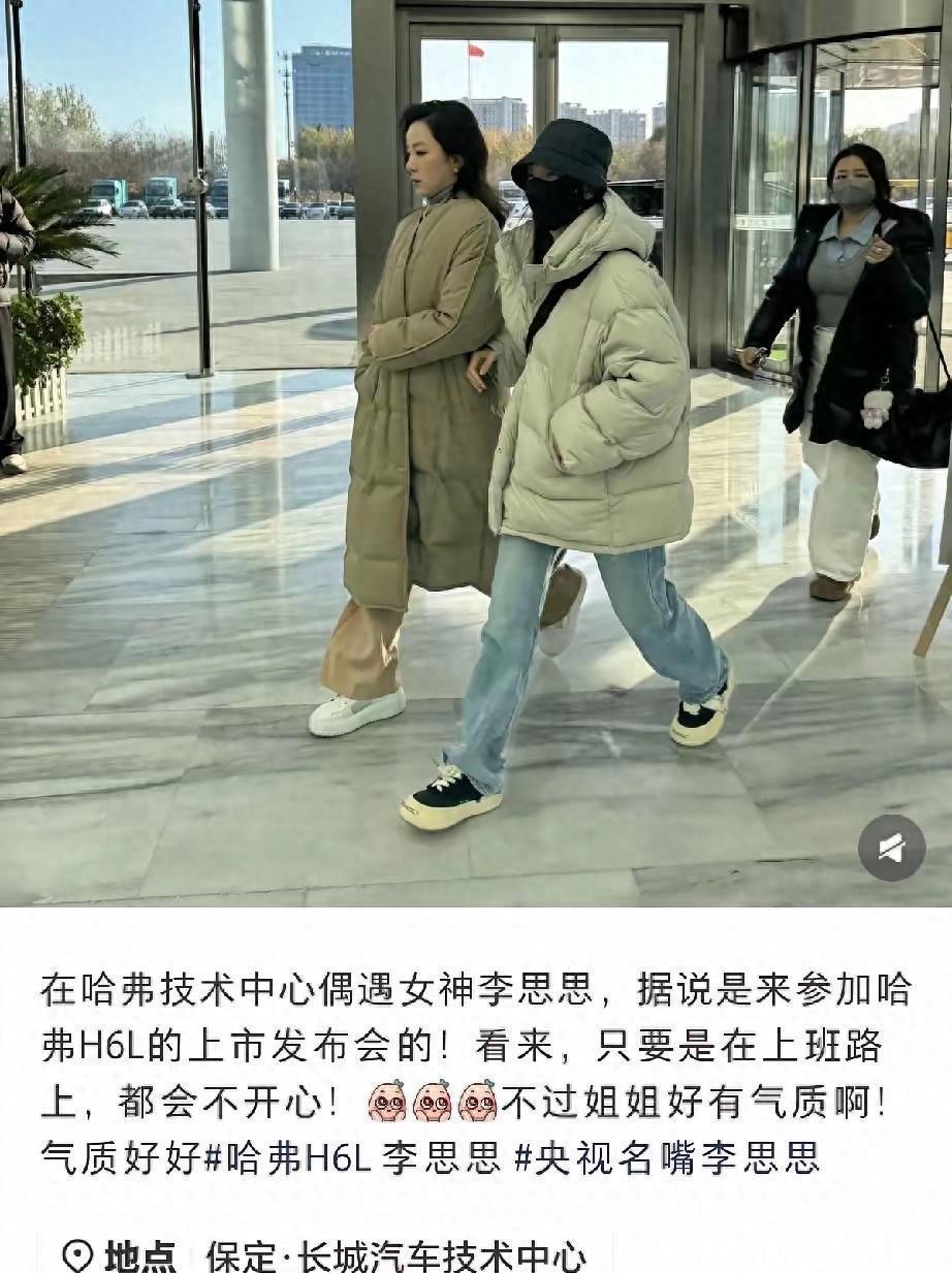 近期,就有网友拍到李思思出席哈弗H6L上市的发布会。再路透中我们能看到李思思裹着一个超级厚的羽绒服现身技术中心。虽然颜值和状态这方面没的说,李思思一直保持的很好。