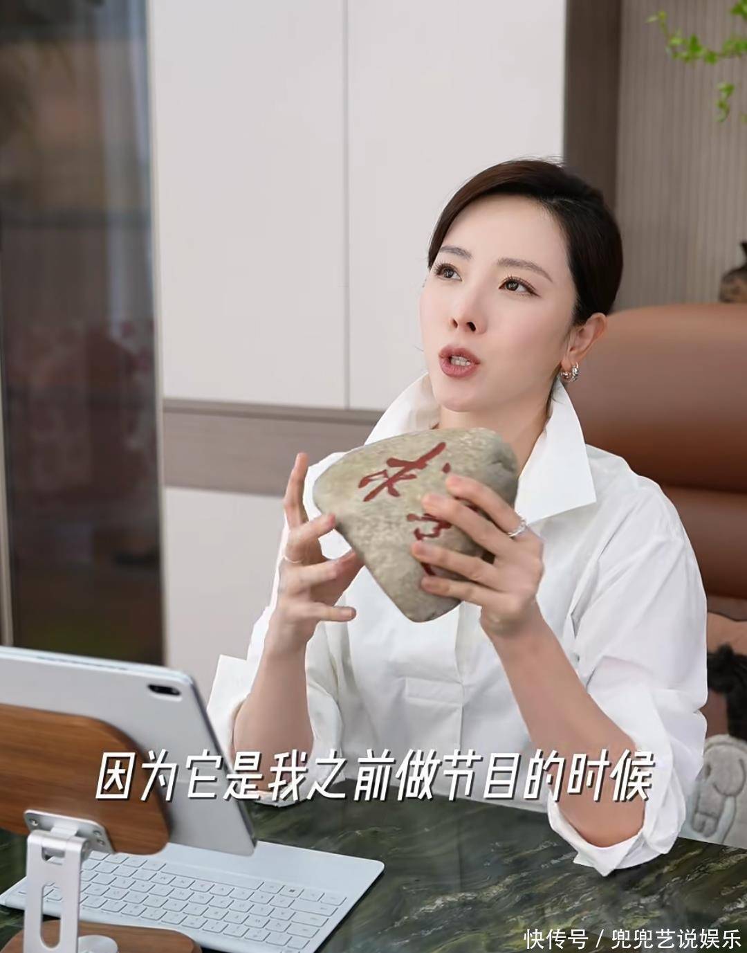 这个石头上刻着“求是”两个字,这个还是之前李思思在做节目时,一位森林防火员送给她的。李思思也想通过这个石头时刻警戒自己要时刻保持真实状态,学会去伪存真。